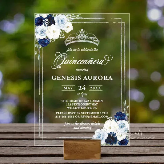 navy blue floral acrylic quinceanera invitations ROSYA50