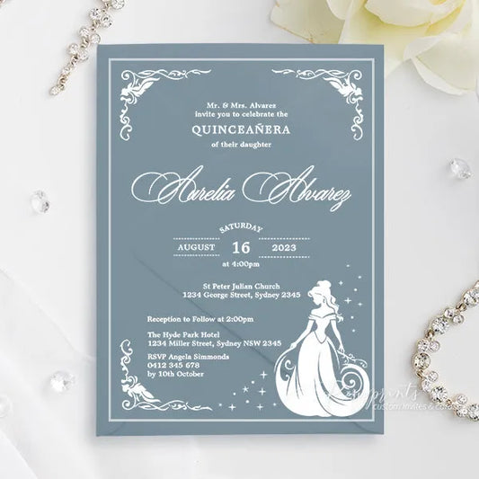 blue Cinderella quince sweet 16 birthday invitations ROSYP54