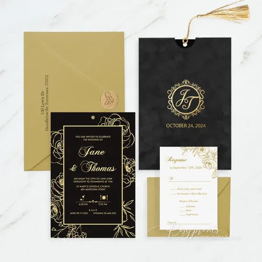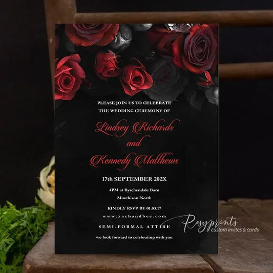Looking for the perfect black wedding invitations? Look no further than Rosy Prints. Their elegant designs and high-quality materials make them a top choice for couples seeking to set the tone for their special day. With a variety of customizable options, color palette and themes, you can create black and gold wedding invitations that truly reflects your style and theme. Make your wedding unforgettable with modern black and white invitations.