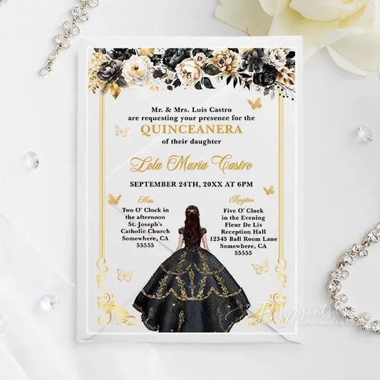 white black and gold acrylic quinceanera sweet 16 invitations ROSYA109