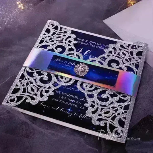 elegant navy blue wedding invitations with silver liners ROSYG03