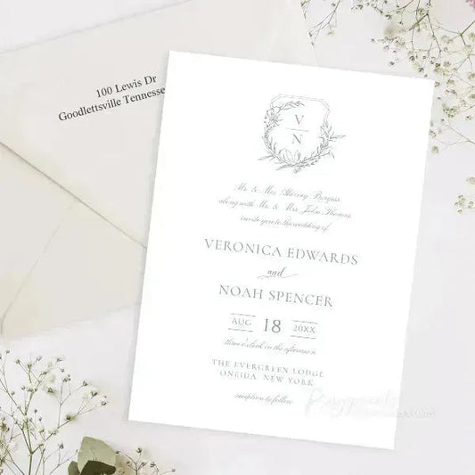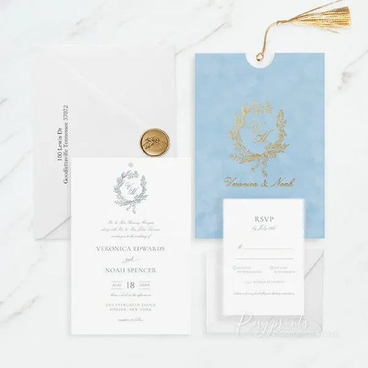 minimal leaf crest dusty blue wedding invitations ROSG22