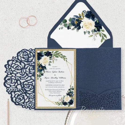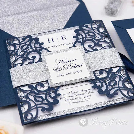 elegant navy blue wedding invitations with silver liners ROSYG03