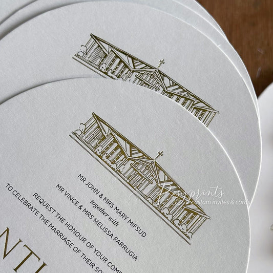 arched gold foil wedding invitations with venue sketch ROSYF09