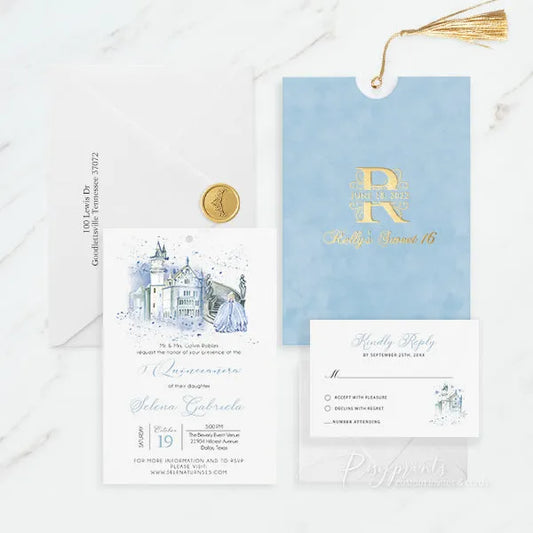 blue Cinderella quince sweet 16 birthday invitations ROSYP54