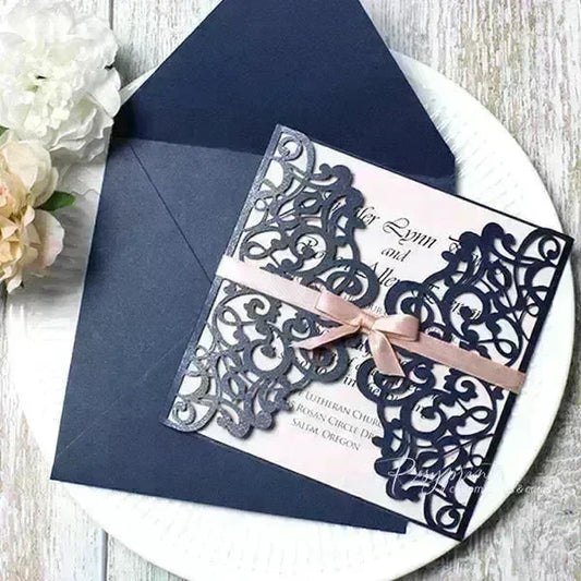 navy blue wedding invitations with rose pink bow ROSG20