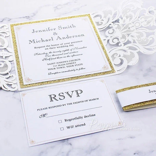elegant white ivory and gold glitter laser cut wedding invitations ROSG40
