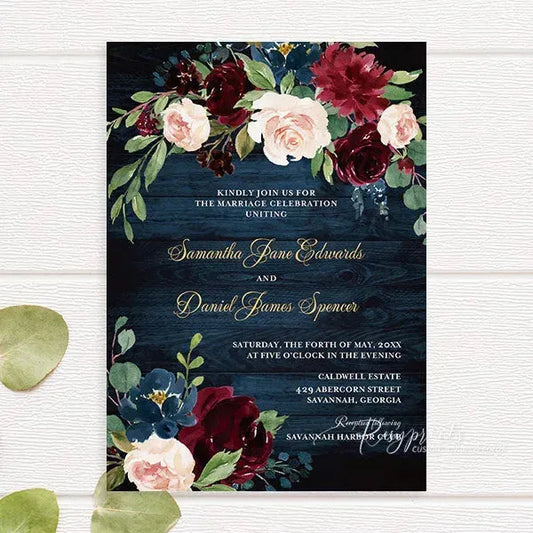burgundy navy and gold rustic wedding invitations RPFLAT03