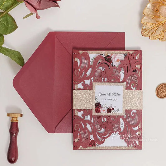 modern elegant burgundy and gold wedding invitations ROSYG21