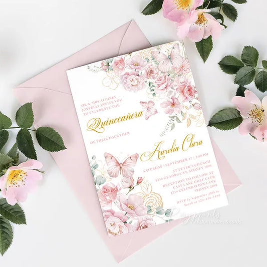 pink floral quince invitations butterfly 1st birthday invitation ROSYP66