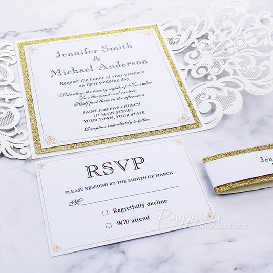 elegant white ivory and gold glitter laser cut wedding invitations ROSG40