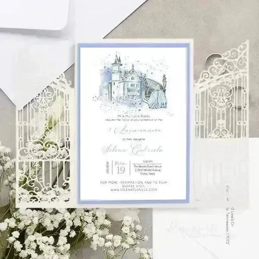 Cinderella blue gold quinceanera sweet 16 invitations ROSYP23-B