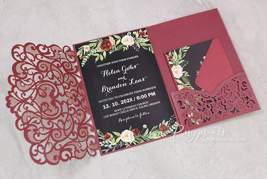 If you're planning a formal wedding and looking for a unique way to invite your guests, consider buying pocket wedding invitations from Rosy Prints. These elegant wedding invitations not only provide a polished look but also offer a practical solution for including all the essential details of your special day. With their elegant design and customizable options, pocket-fold invitations can reflect your wedding theme while making it easy for guests to keep all the information in one place. Explore various colors, materials, and embellishments to create the perfect invitation that sets the tone for your celebration.