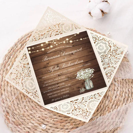woodsy rustic wedding invitations with mason jar and baby's breath ROSYP62