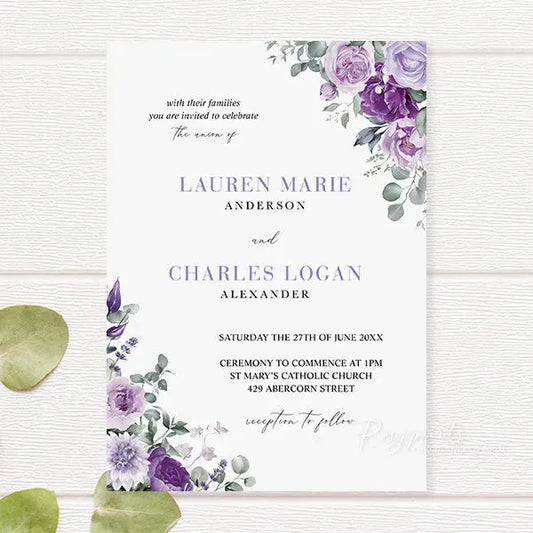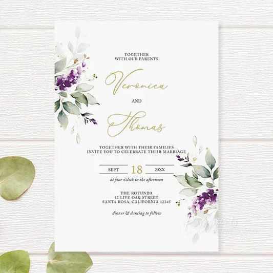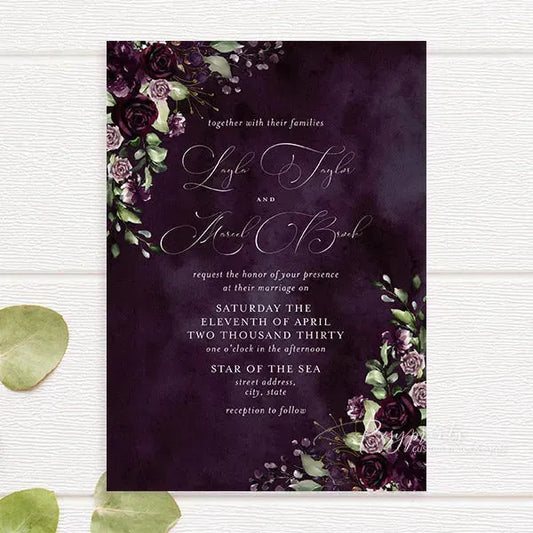 Custom purple wedding invitations from Rosy Prints. Their lavender designs and quality materials will surely impress your guests and set the perfect tone for your wedding. With a variety of styles to choose from, you can find the ideal plum wedding invitations that matches your wedding theme and personal taste. Don’t miss the opportunity to create lasting memories with beautifully crafted invites.