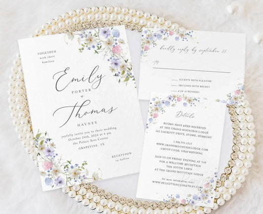pastel wildflower pink blue and purple wedding invitations ROSYV11