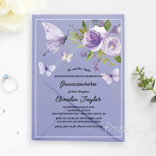 purple butterfly clear acrylic Quince invitations ROSYA56
