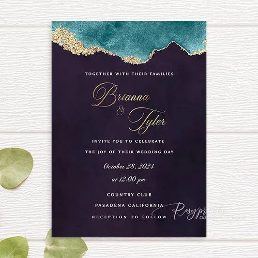 dark purple teal gold agate wedding invitations RPFLAT02