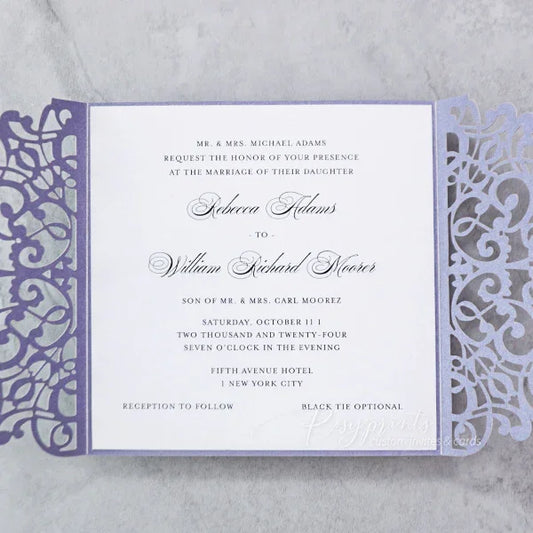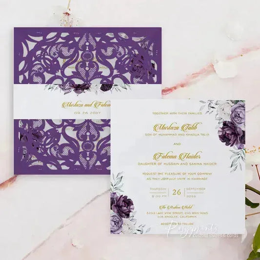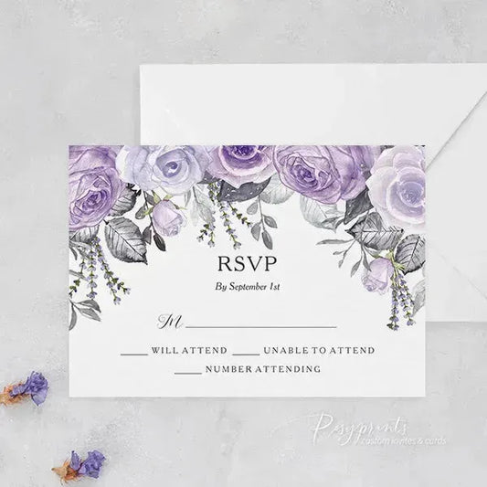 Custom purple wedding invitations from Rosy Prints. Their lavender designs and quality materials will surely impress your guests and set the perfect tone for your wedding. With a variety of styles to choose from, you can find the ideal plum wedding invitations that matches your wedding theme and personal taste. Don’t miss the opportunity to create lasting memories with beautifully crafted invites.