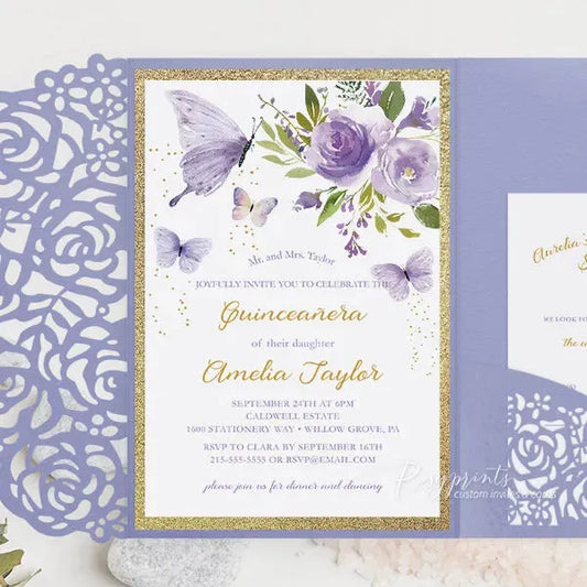 lilac purple and gold butterfly quinceanera invitations ROSYP27