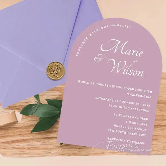 shades of purple arched wedding invitations RPS14