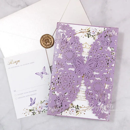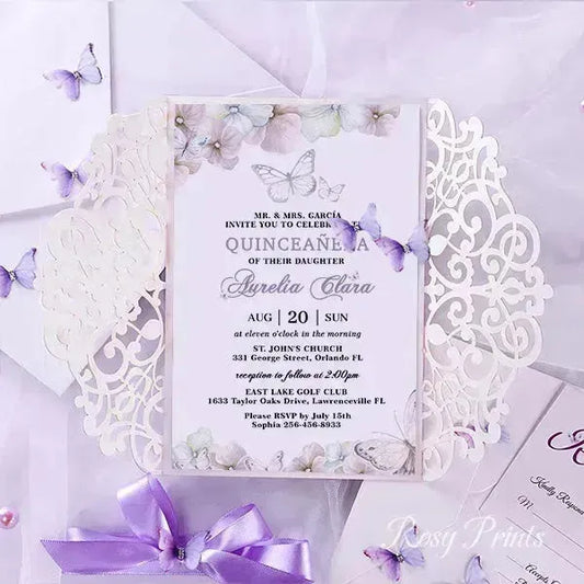 lilac purple and silver butterfly Quinceanera invitations ROSG10