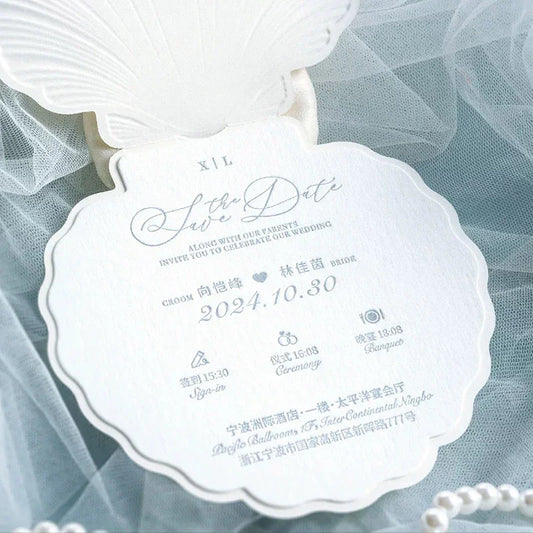 beach pearl white seashell letterpress save the dates ROSYS09-B