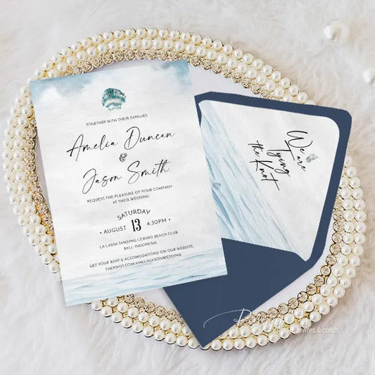 ocean light blue beach seashell vellum wedding invitations RPV15